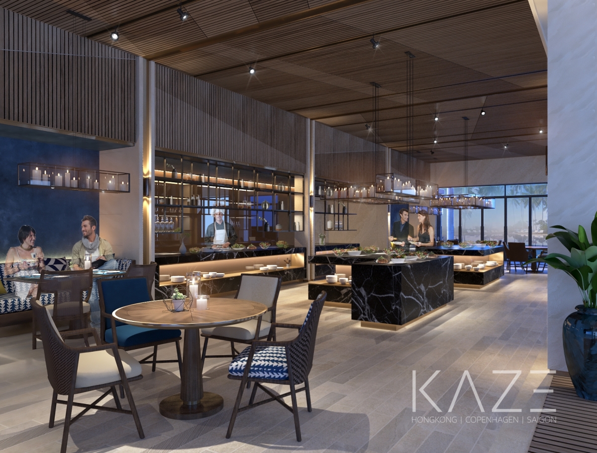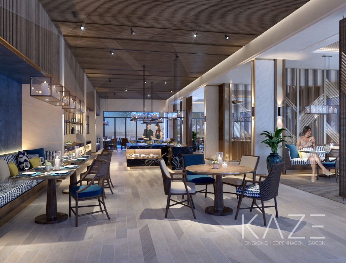 The A’la Carte Restaurant specializes in Vietnamese and Pan Asia cuisine. Luxury food and beverages are available for diners arriving by land and sea. Banquet seating and couple seating is featured throughout the space. Wood is the main material, and most fabric selection is done in marine colors, highlighted with splashed of sun.