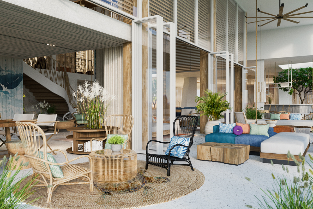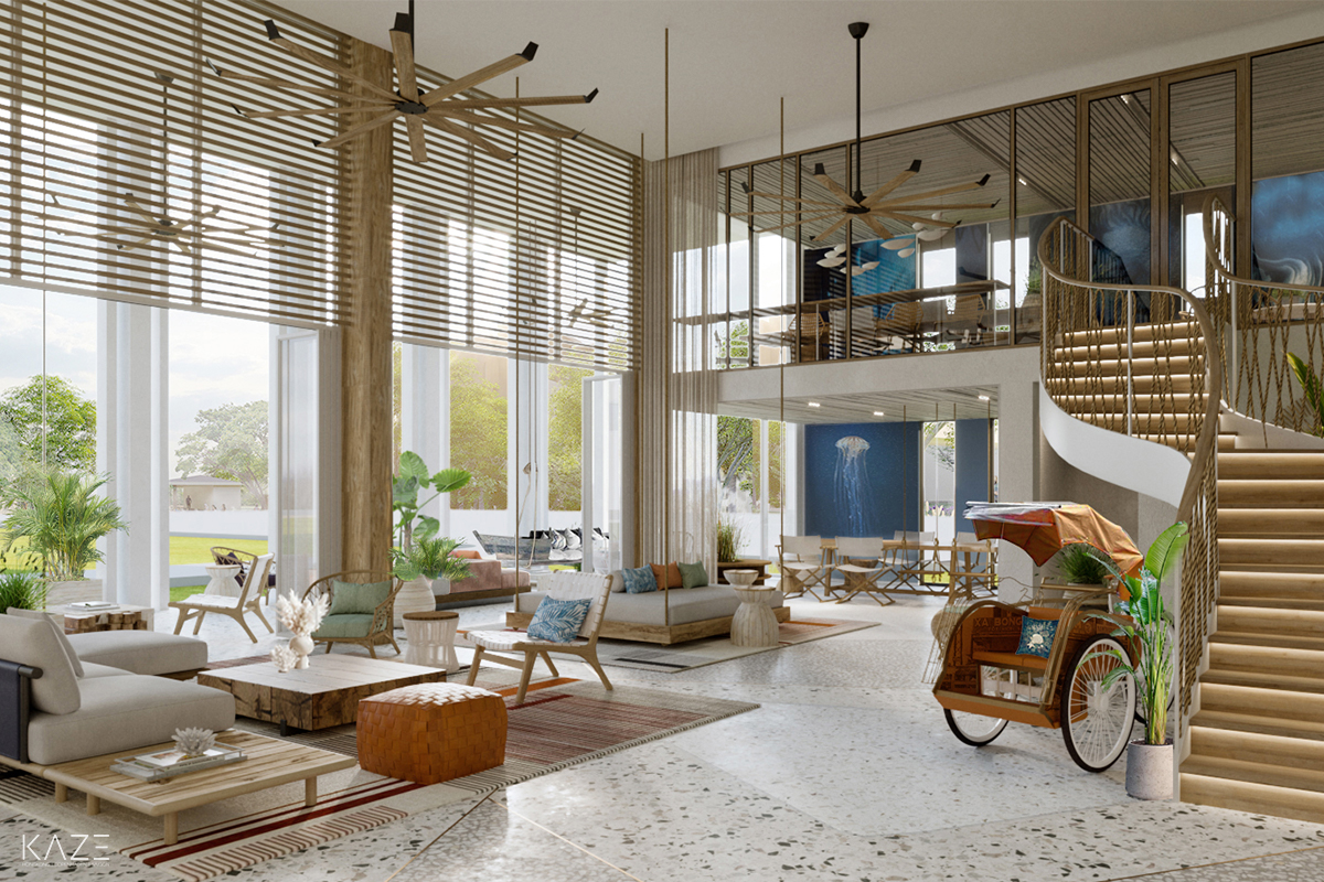 For this development project, we chose textured fabrics , wood accents and organic elements that highlight the indoor/outdoor connection and evoke a breezy, airy vibe.