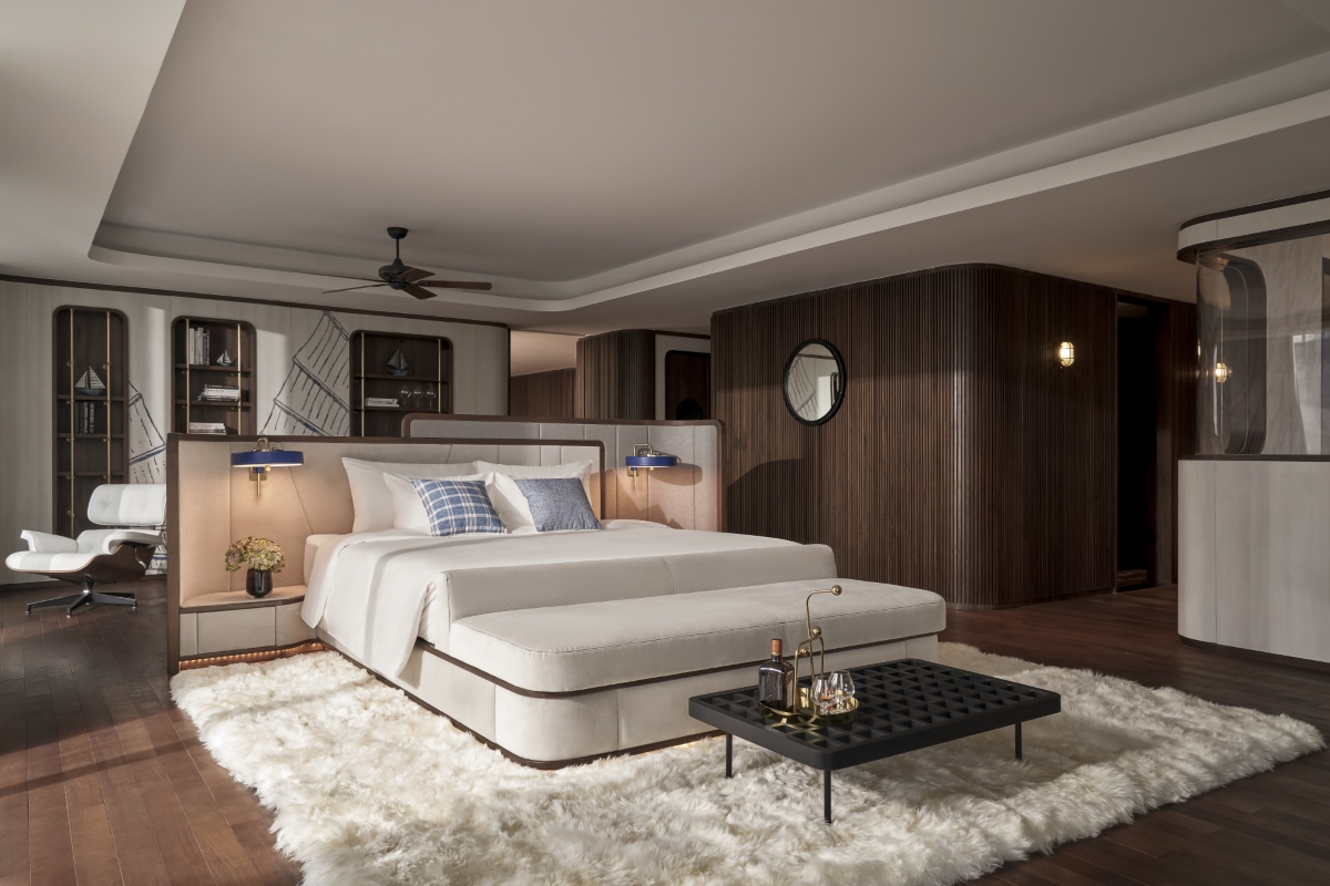 The hotel’s concept and design language are consistently carried through, from the lavish main lobby space to the guest rooms, creating an immersive experience for every guest. Stepping into the reception hall, one is immediately struck by the opulence of the atrium, filled with natural light and connected to the “Fern” all-day dining, evoking the image of a contemporary, yet raw, luxurious yacht.