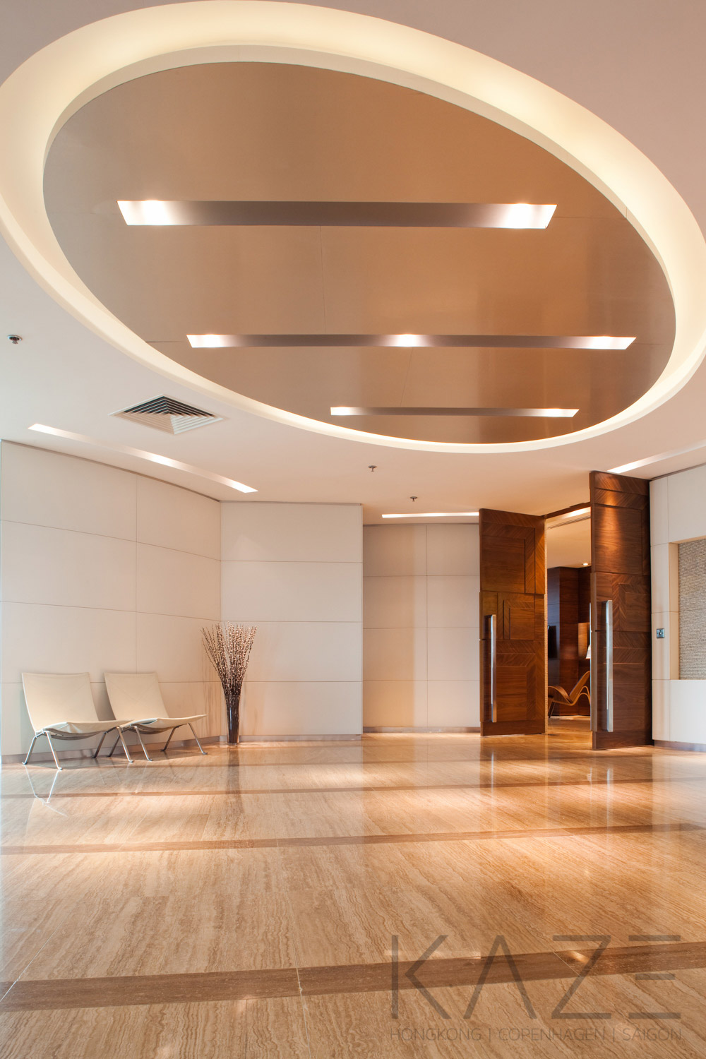 Eight years ago, it was difficult to build expensive designs in Vietnam but this was our brief. Masan wanted an exclusive office. We used the finest materials available in Vietnam - travertine, walnut veneer, leather, mirrored glass and stainless steel. It was a fun challenge. One of the design highlights was using a yellow granite stone. We had wavy lines hand cut in the stone which gave it a fabulous dynamic effect and this became a part of Masan branding.