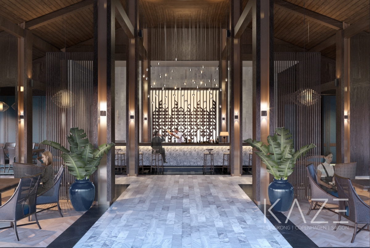 The architecture itself is intended to be understated with a traditional Vietnamese thatched roof, wooden beam structure, and dark wooden columns. In contrast, the interior spaces are rich and sophisticated with marble floors and wooden carvings reflecting the local culture. Although different, the interior and exterior designs complement each other in perfect harmony.